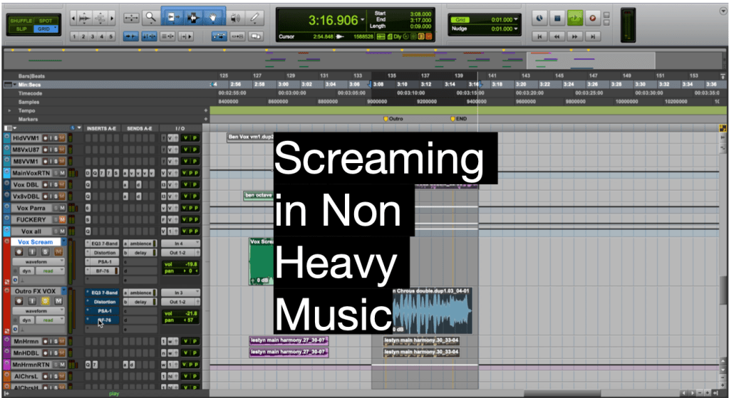 Screaming can be used in much the same way as any other textural overdub. For example, it can provide an interesting addition to the backing vocal texture, sort of like a harmony without a definite pitch. Using naturally distorted vocals in this way can add movement to an otherwise static piece of harmony, thicken the vocals without making it sound muddy, and create an unusual timbre that can really help bring the artists creative vision to life.
