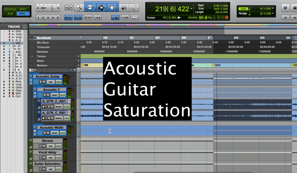 And that brings us to the topic of this post – distortion on acoustic guitar. More specifically, I’m talking about parallel distortion. Parallel processing is a pretty powerful tool, and it’s almost always something I reach for. In this case my thinking was that having a super saturated version of the guitar track would add thickness in the lower mid frequencies without adding any extra muddiness to the mix.